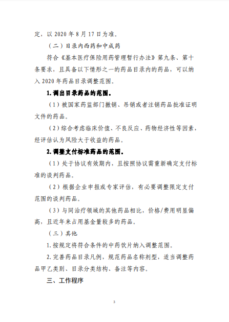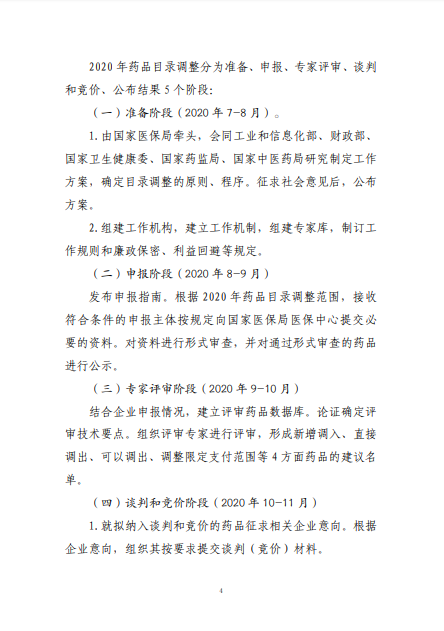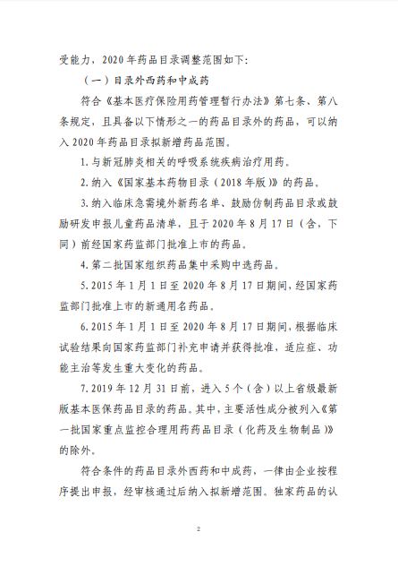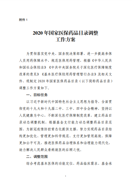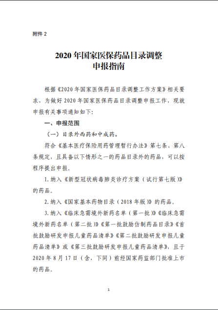 2020年8月3日-10日,國(guó)家醫(yī)療保障局就《2020年國(guó)家醫(yī)保藥品目錄調(diào)整工作方案(征求意見稿)》向社會(huì)公開征求了意見。8月17日,《2020年國(guó)家醫(yī)保藥品目錄調(diào)整工作方案》和《2020年國(guó)家醫(yī)保藥品目錄調(diào)整申報(bào)指南》正式公布。